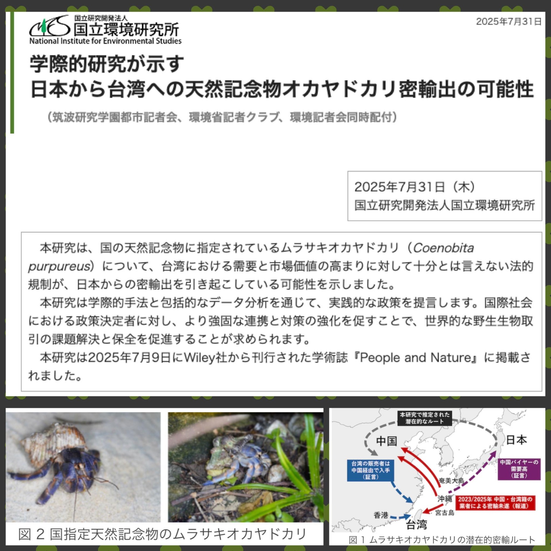 *2025年,学際的研究が示す日本から台湾への天然記念物オカヤドカリ密輸出の可能性,国立環境研究所 / 環境省